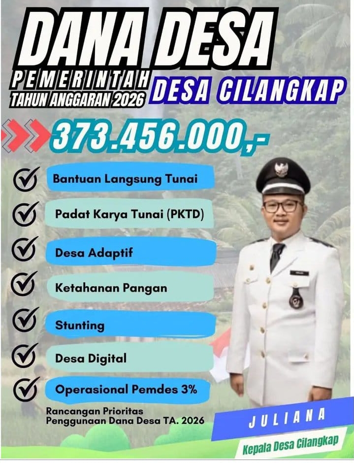 Juliana menjelaskan, Dana Desa (DD) Cilangkap Tahun 2026 tercatat sebesar Rp373.456.000. Dana tersebut akan dialokasikan untuk sejumlah program prioritas, di antaranya: