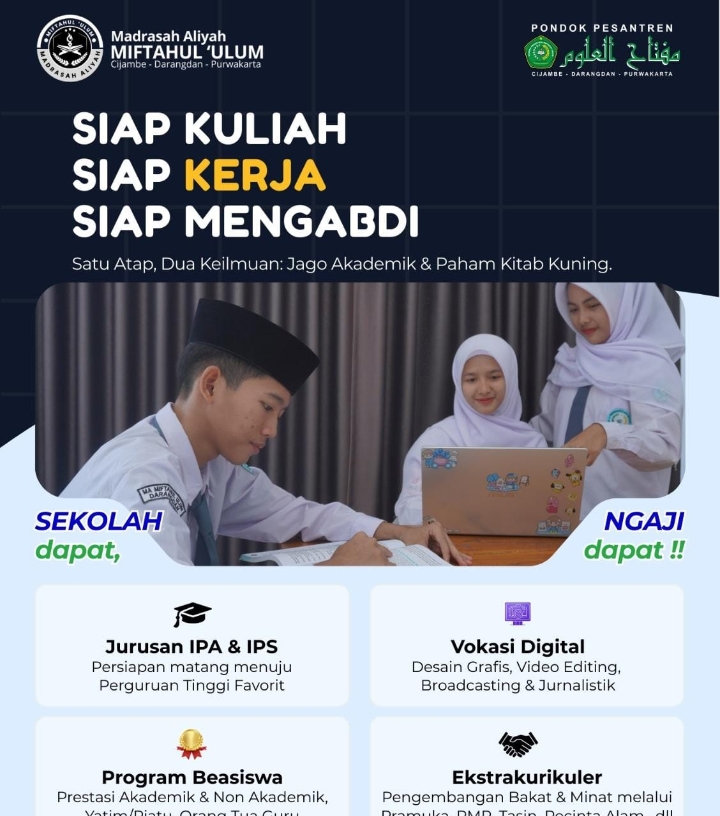 “Bagi yang ingin kuliah di PTN favorit, memiliki skill video editing dan desain grafis, hingga mendalami kitab kuning, MAN Miftahul Ulum adalah pilihan tepat,” ujarnya.