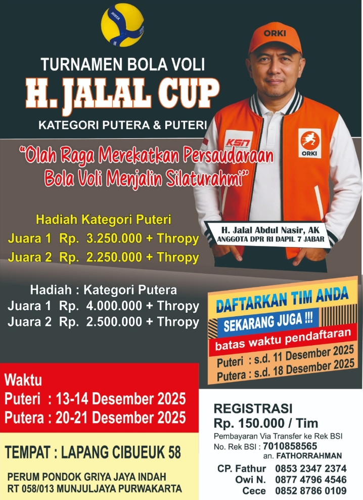 Adapun, dalam Turnamen Bola Volly Cup H. Jalal tersebut memperebutkan Hadiah Kategori Puteri Juara Pertama sebesar Rp 3.250.000 plus Thropy, Juara kedua Rp 2.250.000 plus Thropy .
